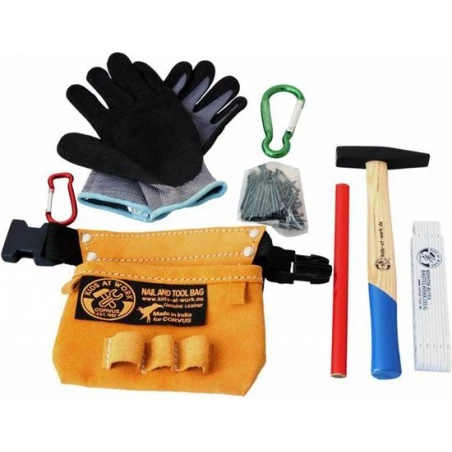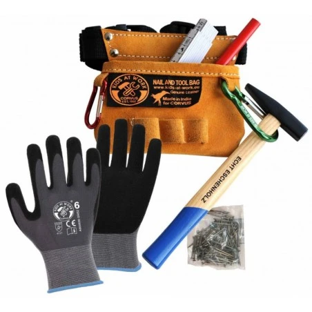 Heerlijk aan de slag met dit 8delig gereedschapsset van Kids at Work. Doe de gereedschapsgordel om; deze is verstelbaar, en maak met de gereedschappen een mooi kunstwerk. Met de timmermanspotlood en de meetlat schrijf je de maten op. De hamer heb je dan niet nodig, berg deze dan op in de gereedschapsgordel. Wanneer je met de hamer aan de slag gaat, doe je de handschoenen aan en pak je de spijkers. Zo sla je de spijker op z’n kop!