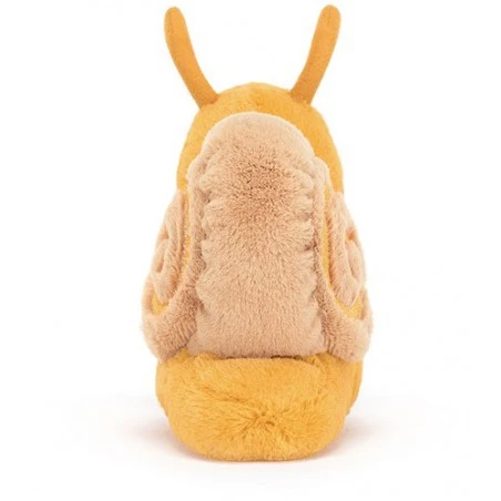 De vrolijke gele Knuffel Slak Sandy Snail. Sandy Snail is een relaxte slak, met een merkwaardige grijns en een heldere saffraanvacht.