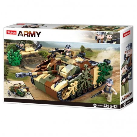 Verberg je zware geschut voor de vijand met de Sluban camouflage tank. Dankzij de takken en bladeren aan de zijkant valt deze tank destroyer niet op in het landschap. Perfect dus voor het leggen van een hinderlaag! Dit bouwpakket bestaat uit 544 bouwsteentjes en wordt geleverd met drie soldaten die de tank, het geschut besturen en het voertuig beschermen tegen vijandelijke aanvallen van dichtbij.